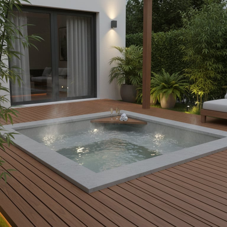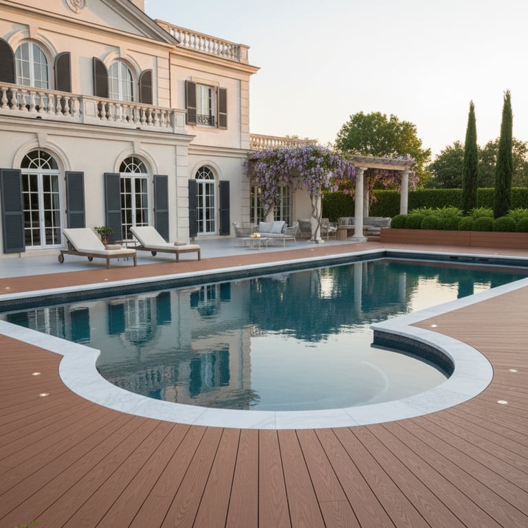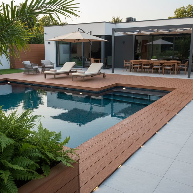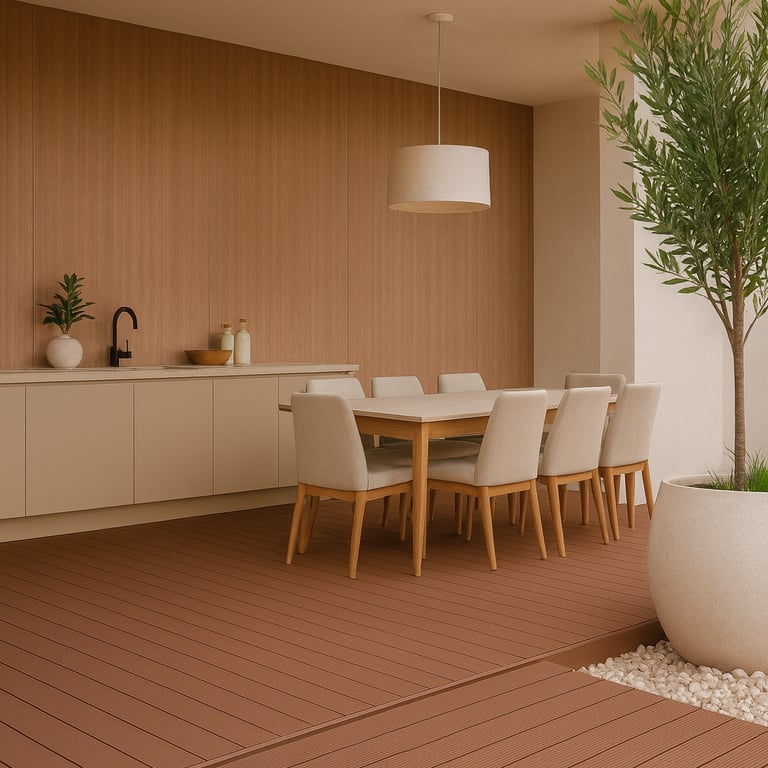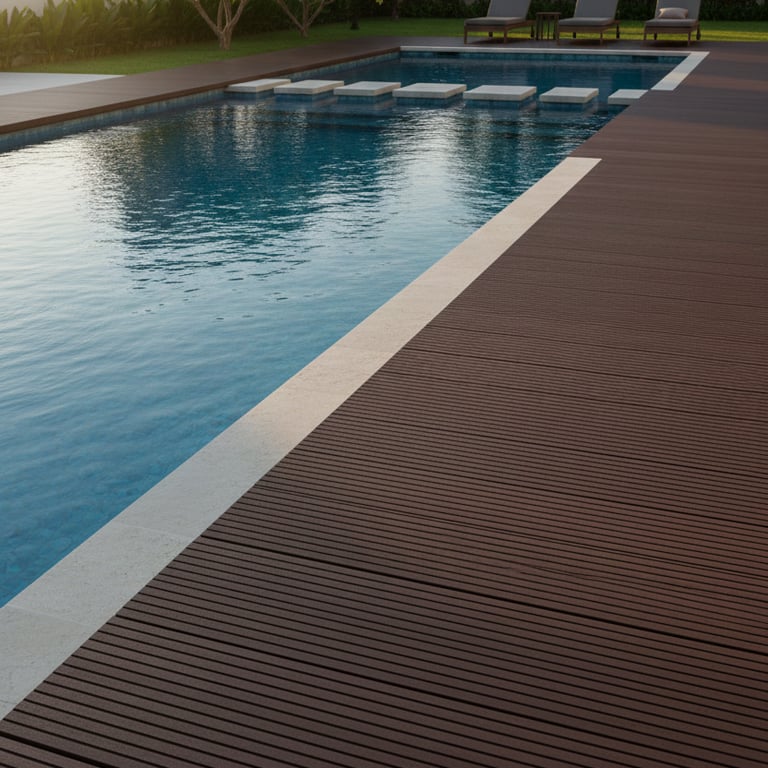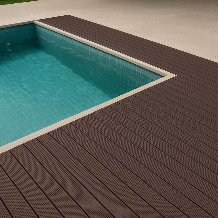 Acabamento: Tábuas modulares para revestimento de áreas externas (decks, piscinas, varandas, jardins) com resistência à umidade e baixa manutenção.