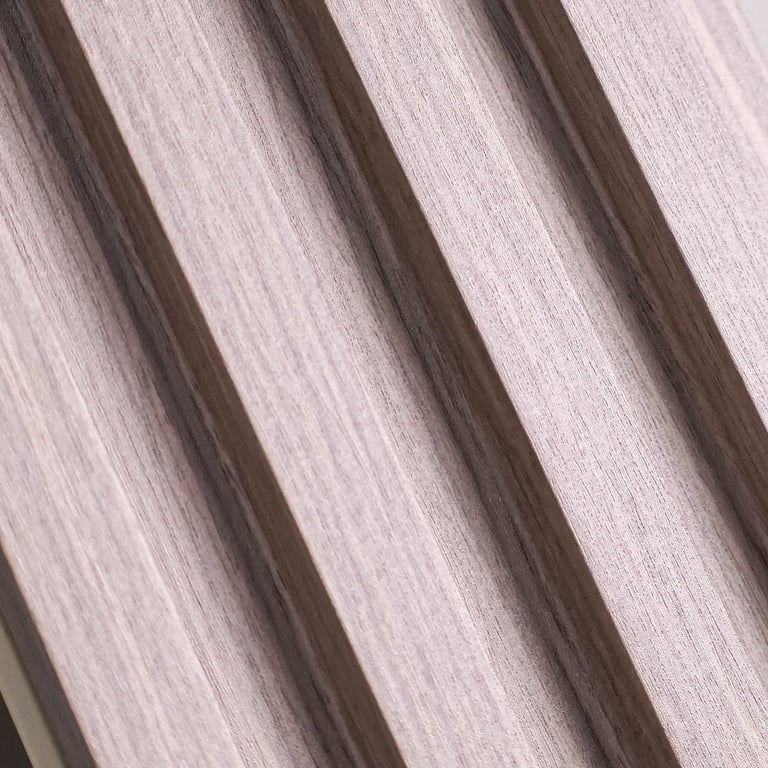 Produzido em WPC (Wood Plastic Composite), o painel é composto por uma mistura de fibras de madeira e polímeros de alta performance. Essa combinação garante um material estável, resistente à umidade, menos sujeito a empenamento e com muito mais longevidade em comparação à madeira natural. O resultado é um revestimento com aparência quente e natural, mas com tecnologia pensada para a rotina real.